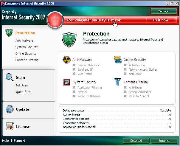 Mở giao diện Kaspersky lên chọn Setting, Lúc này bạn quan sát thanh trạng thái của Kaspersky đang ở màu đỏ (cần update database)