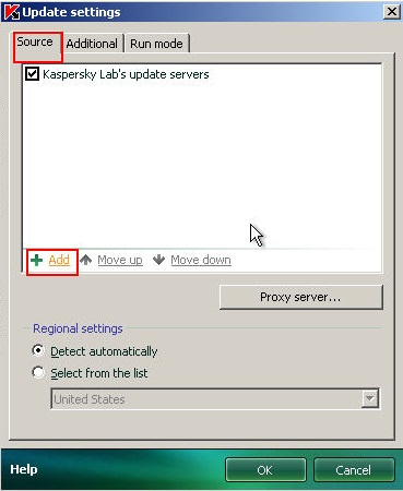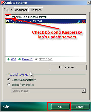 Lưu ý : Sau khi tiến hành update offline thành công bạn cấu hình lại cho chương trình update online lại. Ở bước 6 bạn check lại Kaspersky Lab's Servers sau đó nhấn OK.